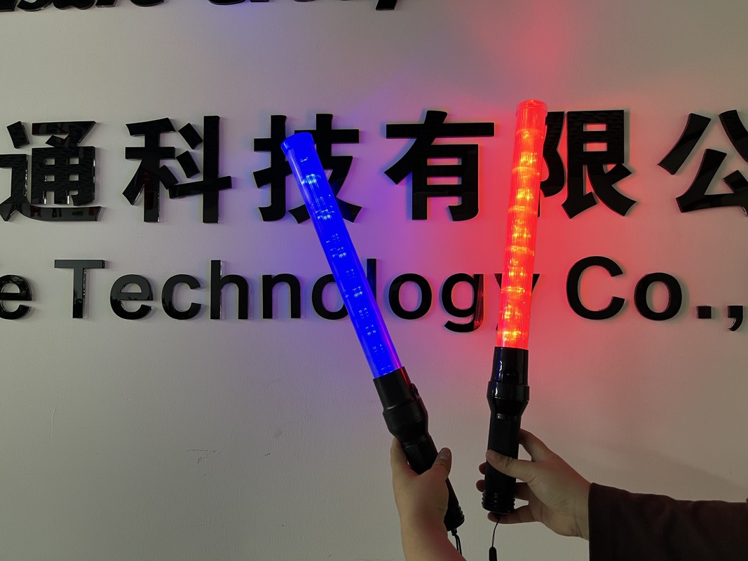 Uma luz de estaca de trânsito de alta visibilidade com iluminação LED, superfícies refletivas e um apito integrado para melhorar a segurança e a comunicação em situações de controlo de trânsito.